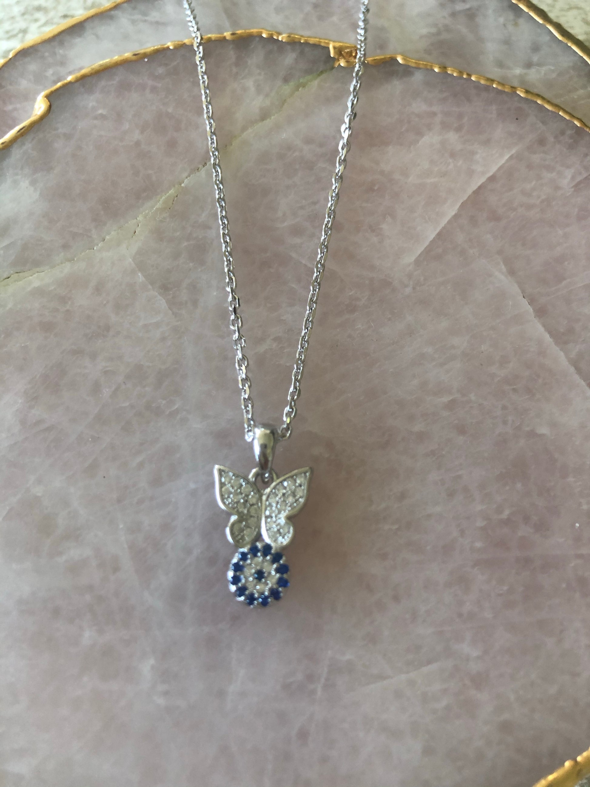 Beautiful Dainty Pave Butterfly Necklace paired with an evil eye, made with the highest quality of CZs.
