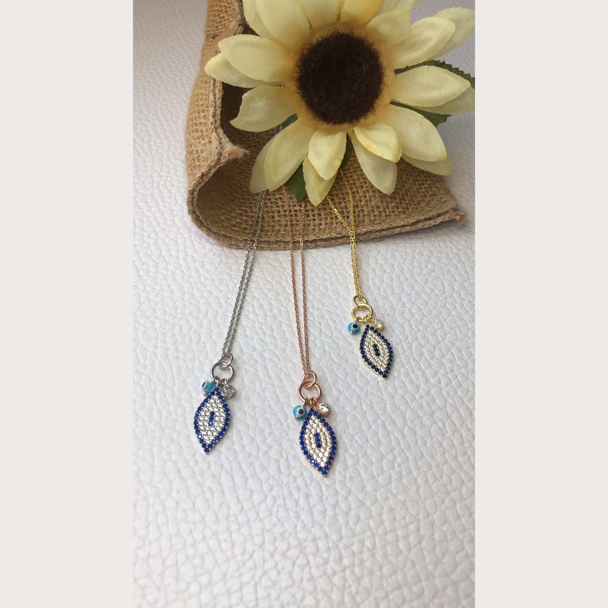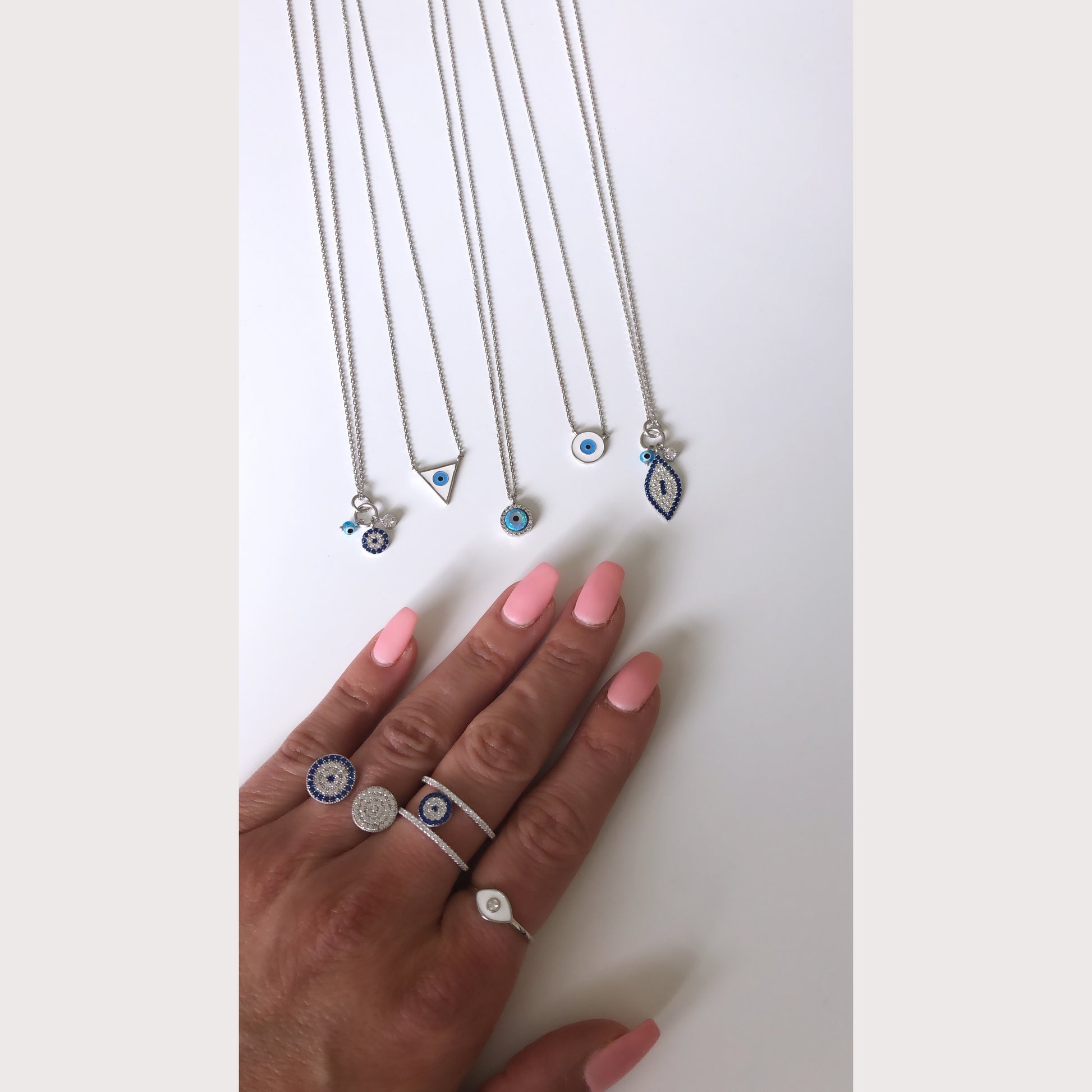 Newest evil eye necklace with white and blue cz's pave set beautifully and hung vertically along with a smaller eye enamel and a needled cubic zirconia.